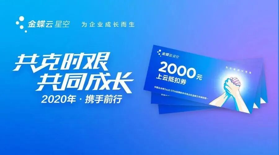 疫情期间,金蝶云·星空加大投入,出台一系列针对中小微企业的帮扶政策。如2000元上云抵扣券、赠送租赁期等,帮助更多中小微企业降低疫情期间经营成本。目前,金蝶云·星空,已入围多省市政府推荐办公软件目录,并入驻华为云市场、联通云市场“复工复产”专区,推动企业疫后恢复经营。